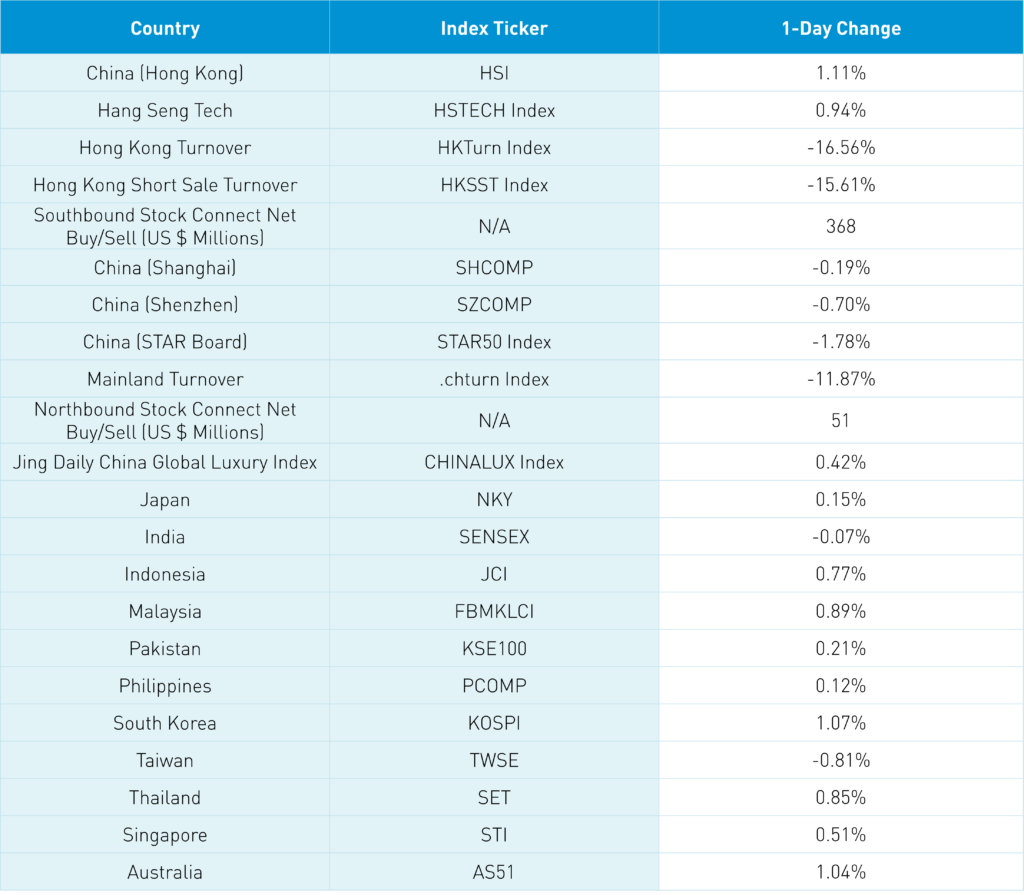 Shanghai, Shenzhen, and the STAR Board were off -0.19%, -0.7%, and -1.78%, respectively, on volume that decreased -11.87% from yesterday, which is 112% of the 1-year average. 1,485 stocks advanced, while 3,175 stocks declined. Value factors and growth factors were mixed as large caps outpaced small caps. The top-performing sectors were consumer staples, which was up +1.39%, healthcare, which gained +0.63%, and energy, which closed higher by +0.29%, while technology fell -2.04%, real estate closed down by -0.67%, and industrials finished lower by -0.51%. The top-performing subsectors were petrochemical, chemical fiber, and energy, while computer hardware, internet, and electronic components lagged. Northbound Stock Connect volumes were moderate/high as foreign investors bought a net $51 million worth of Mainland stocks. CNY and the Asia Dollar Index managed small gains versus the US dollar. Treasury bonds sold off small, while Shanghai copper and steel both gained.