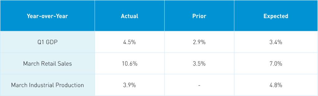 China logged better-than-expected GDP growth in the first quarter of 2023 and retail sales were also unexpectedly strong. Some analysts are calling the release an indication of a continuous, rather than a sporadic, recovery. One broker used the word “revenge spending” to describe what is going on. Meanwhile, industrial production was lower than expected, likely due to slowing global demand as a potential recession looms in the US and Europe.