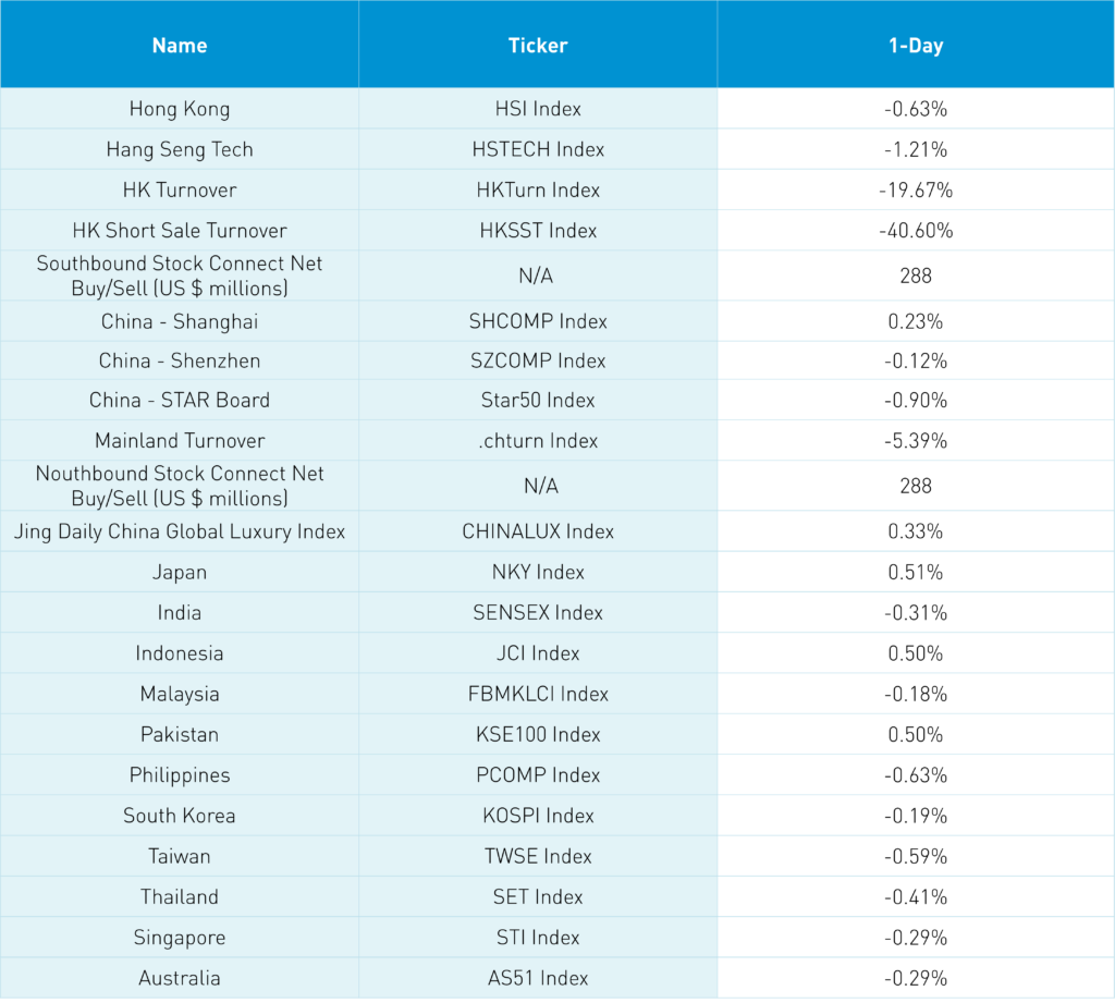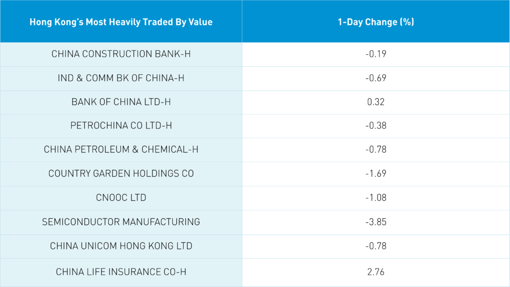 The Hang Seng and Hang Seng Tech indexes fell -0.63% and -1.21%, respectively, on volume that decreased -20% from yesterday. The top-performing sectors overnight were materials, health care, and financials. Meanwhile, consumer discretionary, technology, and utilities were among the worst. Mainland investors bought a net $288 million worth of Hong Kong stocks overnight via Southbound Stock Connect.