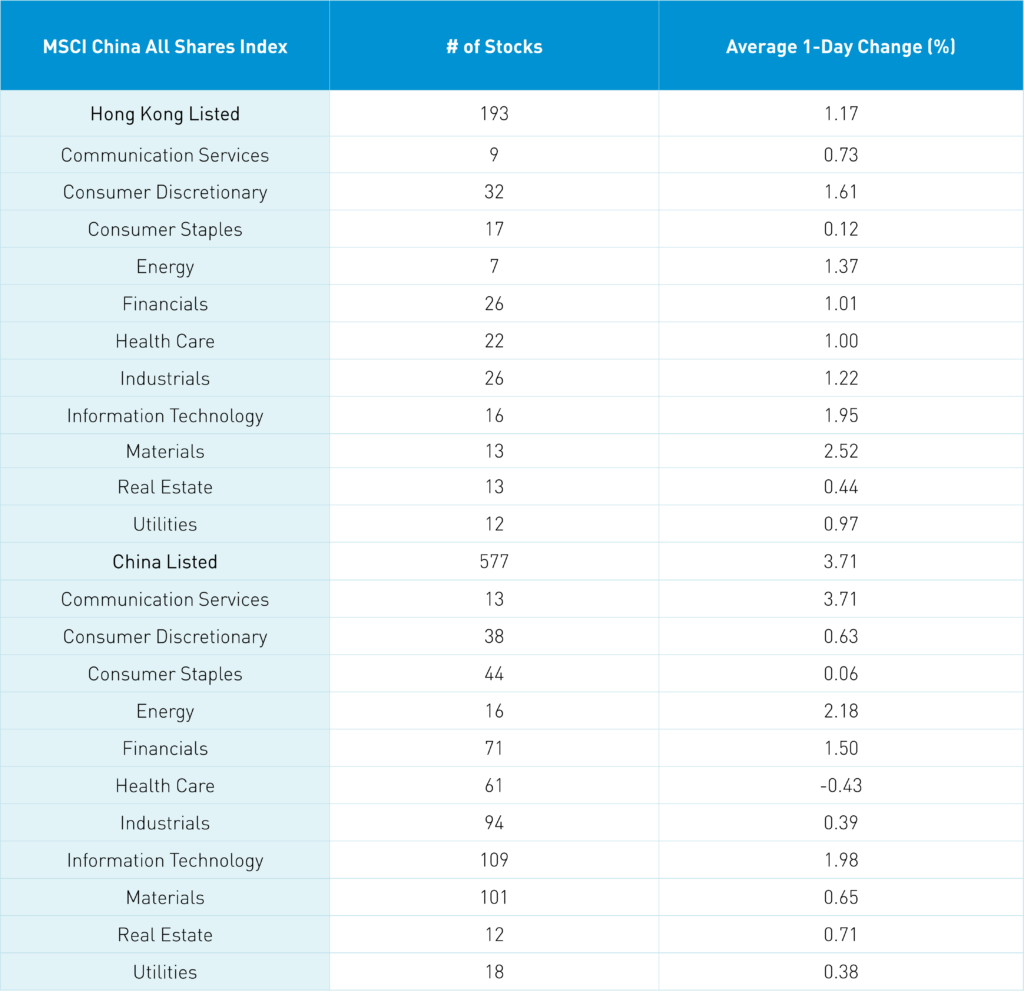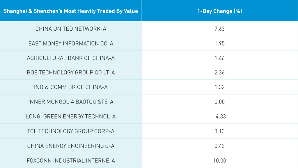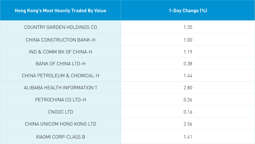 Shanghai, Shenzhen, and the STAR Board all closed higher by +0.88%, +0.47%, and +1.01%, respectively, on volume that increased +20% from yesterday. Foreign investors sold a net -$814 million worth of Mainland stocks overnight. The top-performing sectors were Communication Services, which gained +3.71%, Energy, which gained +2.18%, and Information Technology, which gained +1.98%. Meanwhile, the worst-performing sectors were Health Care, which fell -0.43%, Consumer Staples, which gained +0.06%, and Utilities, which gained +0.38%.