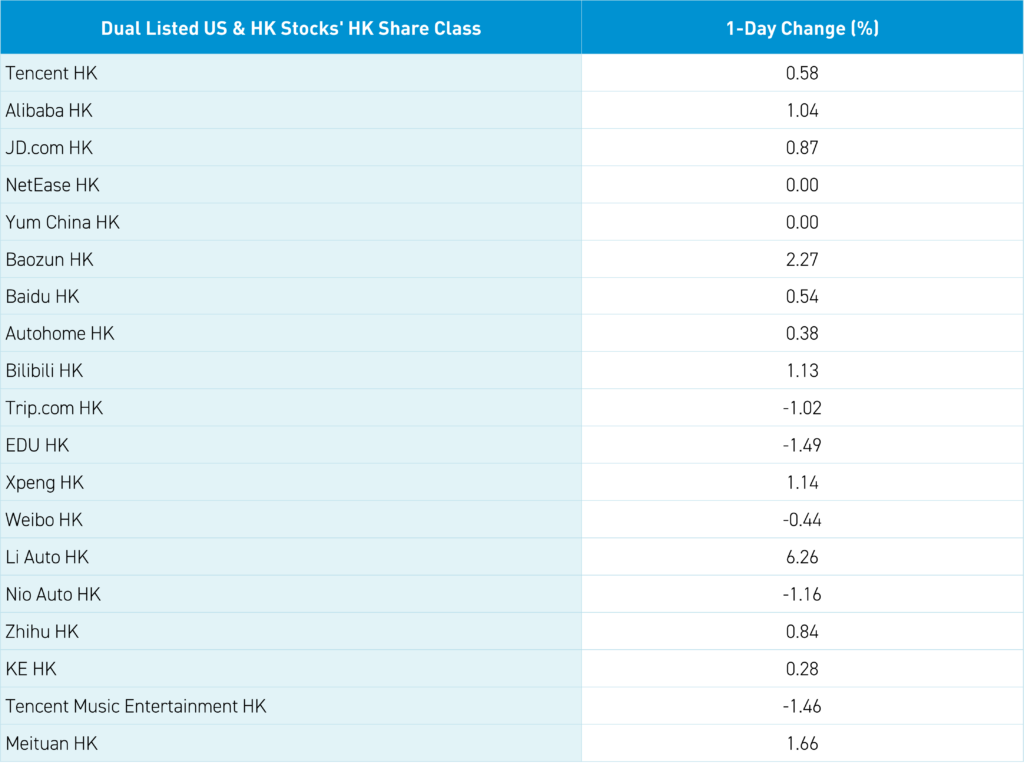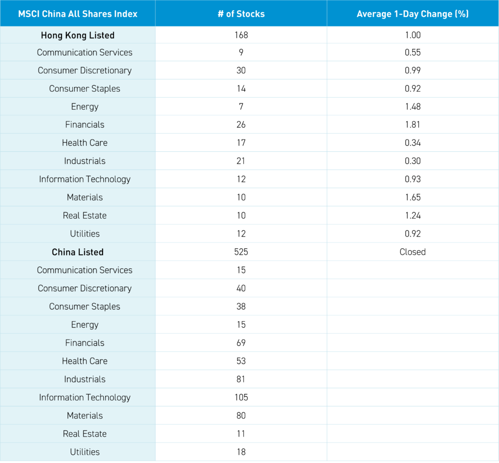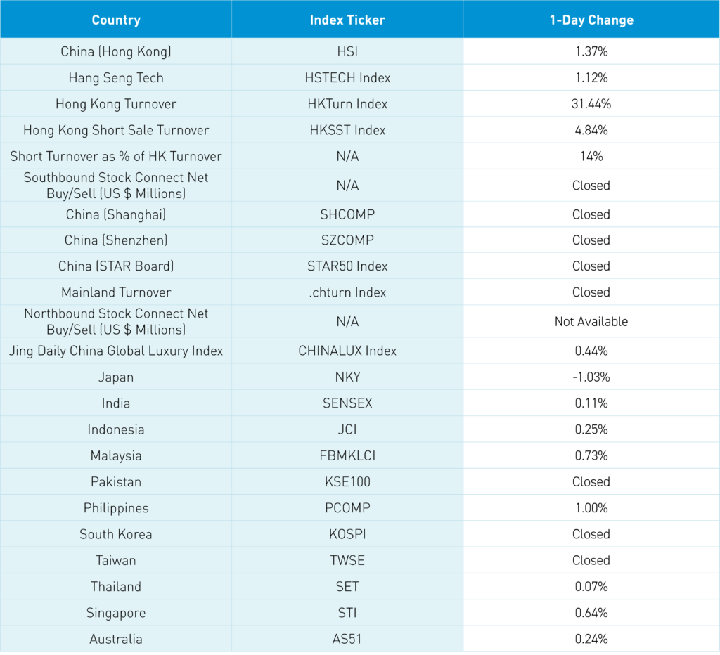 The Hang Seng and Hang Seng Tech indexes gained +1.37% and +1.12%, respectively, on volume that was up +31% from yesterday, which is 61% of the 1-year average. 308 stock advanced while 157 declined. Main Board short turnover increased by +4.84% from yesterday, which is 53% of the 1-year average, as 14% of turnover was short turnover (Hong Kong short turnover includes ETF short volume, which is driven by market makers’ ETF hedging). The value factor and small capitalization stocks outperformed the growth factor and large capitalization stocks. All sectors were positive as Financials gained +1.81%, Materials gained +1.65%, and Energy gained +1.48%. The top-performing subsectors were consumer durables, banks, and energy. Meanwhile, media and household products were the only negative sub-sectors. Southbound Stock Connect was closed.
