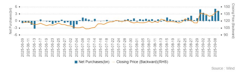 Alibaba topped the charts for trading value today, at levels five times higher than before September 2024’s stimulus announcement. Mainland investors continue to accumulate the stock via Southbound Stock Connect, as shown in the attached chart.