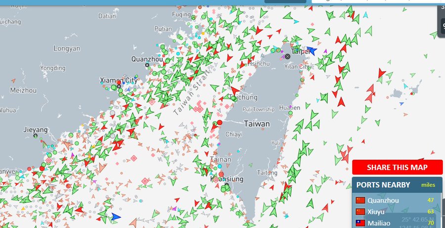 Below is a screenshot of shipping activity in the Strait of Taiwan from here, taken yesterday. Seems normal to me!